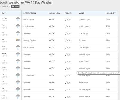 I imagine you will be almost ready to travel to Wenatchee. We had the first snow last Sunday. Here the 10 days forecast. Mainly rain and nice temperature……no SUN unfortunately.