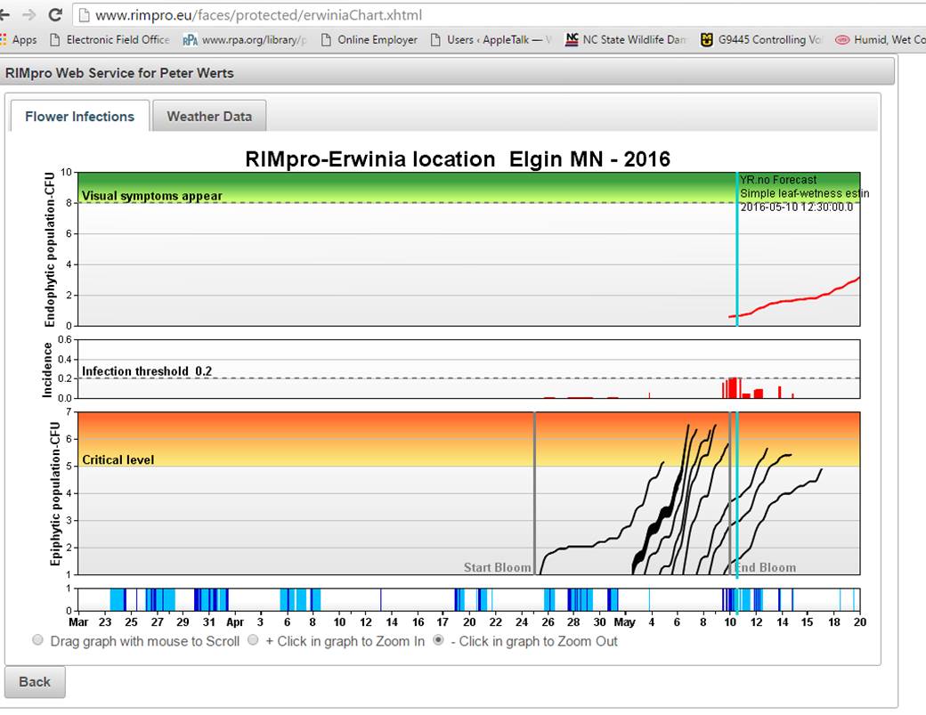 Can you explain the fire blight model and what the “experimental” caveats are? Is the 0.2 infection threshold the point at which we should treat with streptomycin or is it when we have past the critical level for the CFU? I assume the squiggly black lines represent the exponential development of Erwinia amylovora?